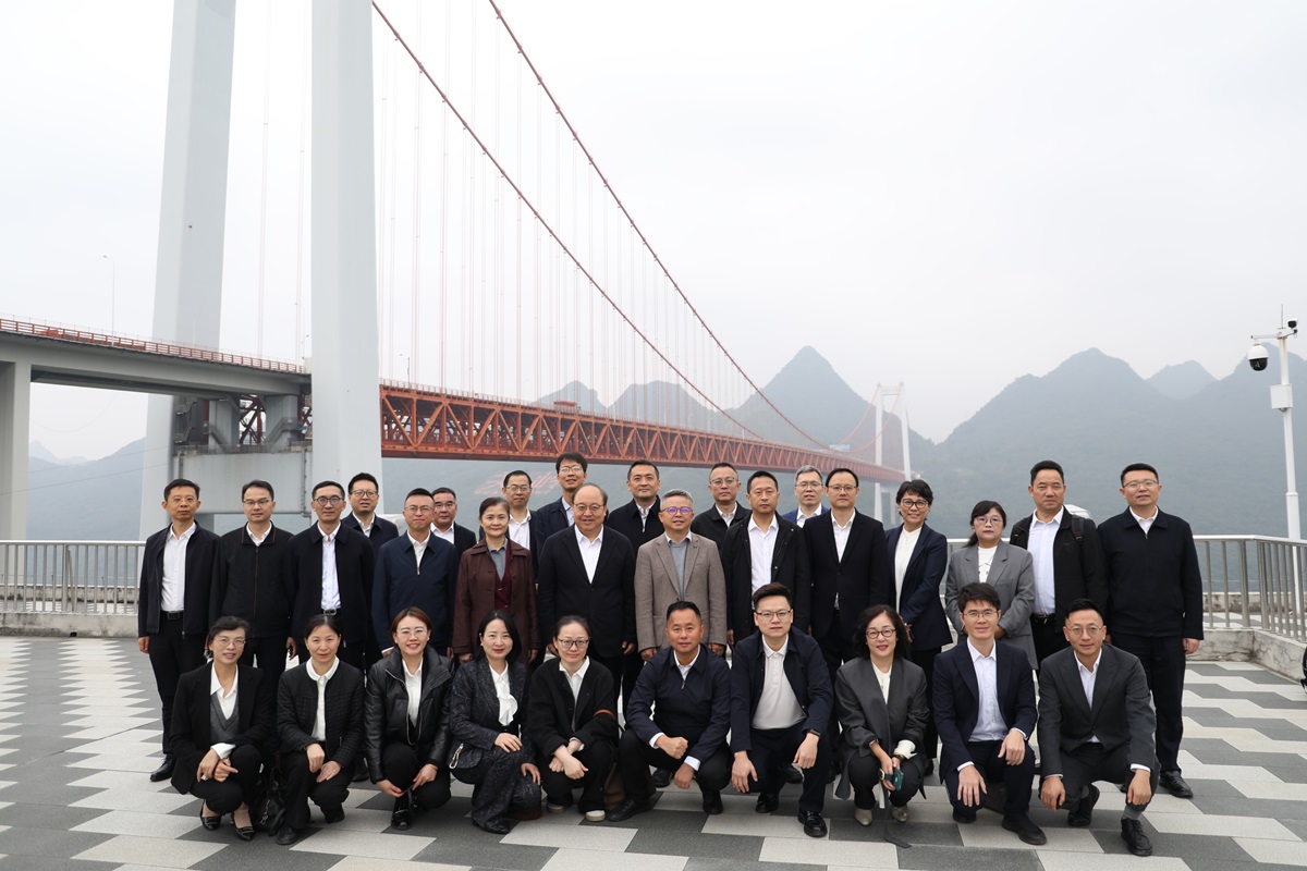 10月23日,中心组一行抵达花江峡谷大桥。这座大桥建成后刷新了多项世界纪录,其“横竖都是世界第一”的技术挑战与宏伟气势给成员们留下了深刻印象。大家详细了解了大桥的设计理念、技术创新和施工难点,切身感受了建设者们攻坚克难的勇气和智慧。该桥多位核心建设负责人——贵州交投副总经理(总工程师)韩洪举、贵州桥梁集团总经理田景贵、贵州交通勘察设计院总工程师杨健、贵州桥梁集团第三分公司六安8标总工程师刘豪、贵州省交通规划勘察设计研究院股份有限公司交通事业部桥梁设计分院院长叶洪平、贵州省交通规划勘察设计研究院股份有限公司交通事业部一分院院长陈竹等校友陪同参观并详细介绍。他们均是学校不同年代的优秀毕业生,作为这一“世界级”超级工程从勘察选线、设计到施工的全链条骨干,展现了交大人在国家重大工程建设中的担当与作为。