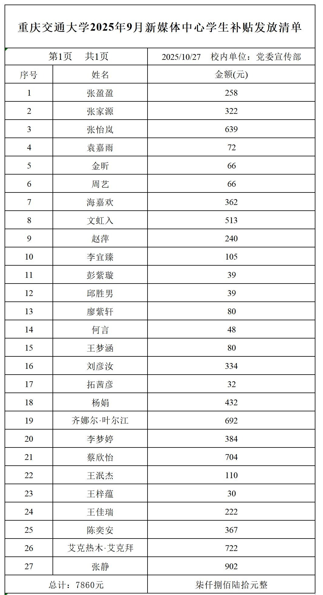 重庆交通大学2025年9月新媒体中心学生补贴发放清单