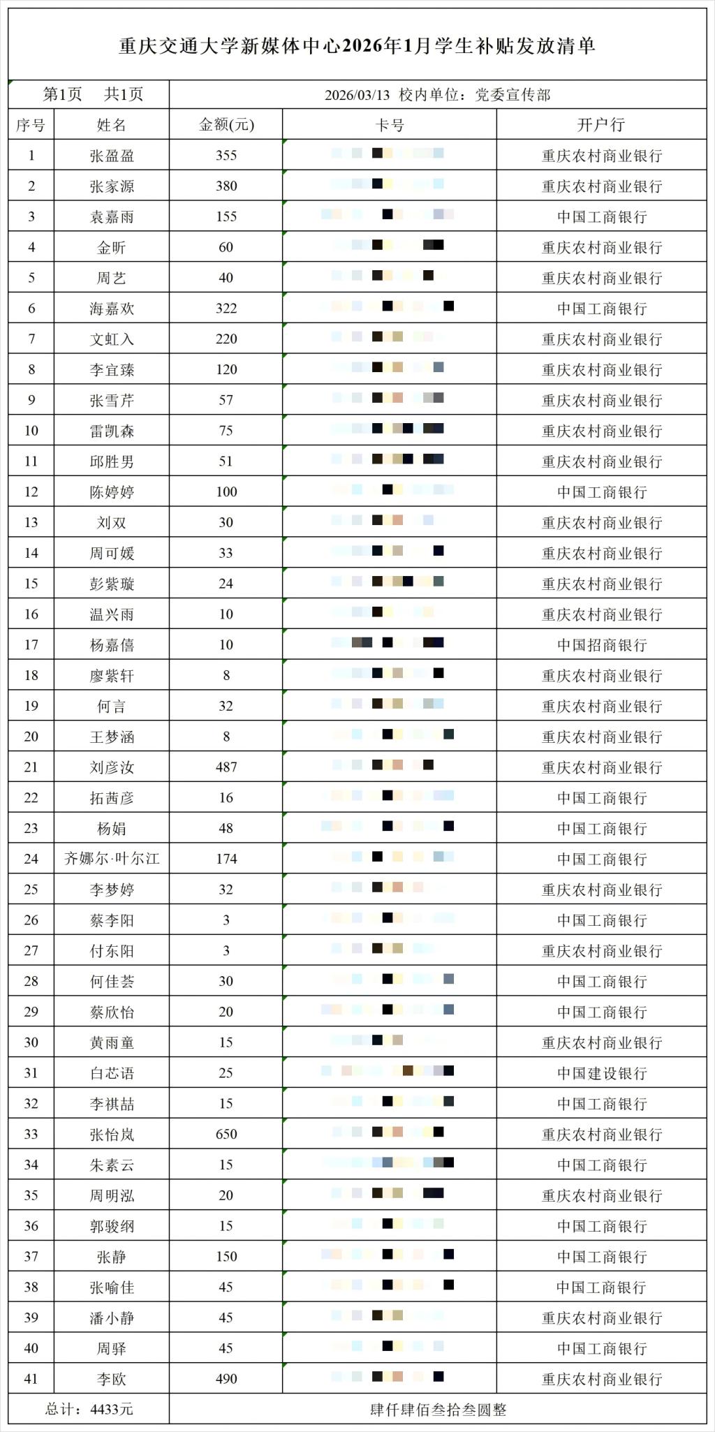 重庆交通大学新媒体中心2026年1月学生补助发放清单