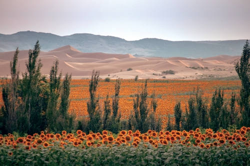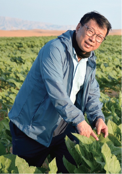 易志坚在乌兰布和沙漠基地察看向日葵的长势。 受访者供图
